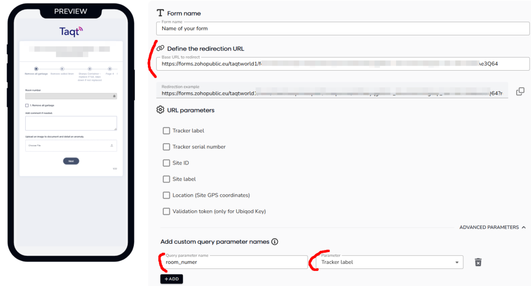 interface configuration of Ubiqod, enter the Zoho Form URL in the Base URL. In advanced parameters, map the room_number parameter with the Tracker Label.