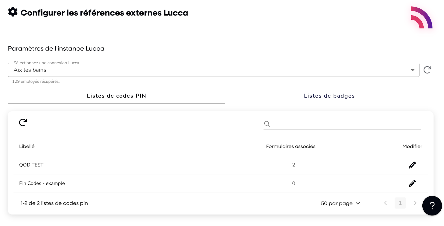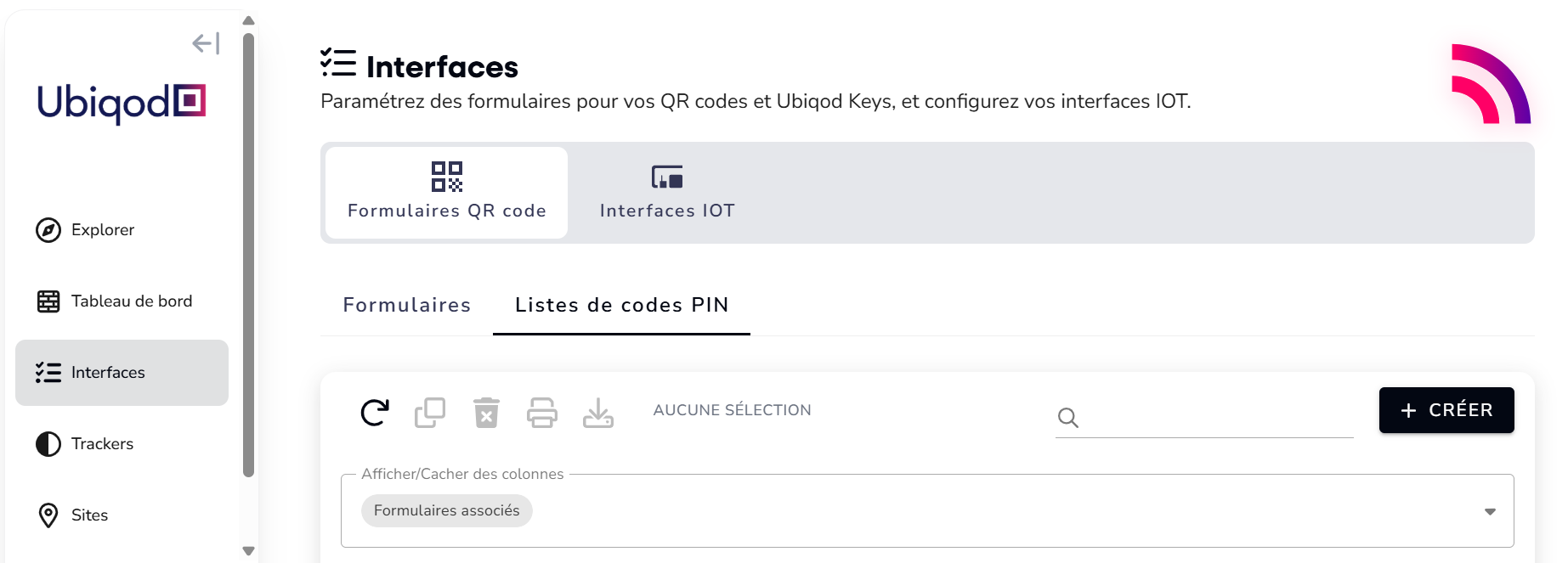 Dans le menu Interfaces, allez dans l'onglet Formulaires QR code, puis Listes de codes PIN :