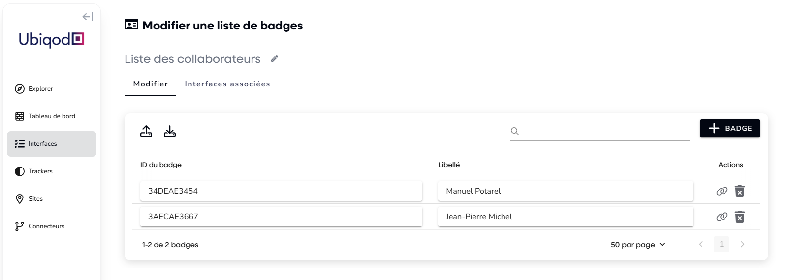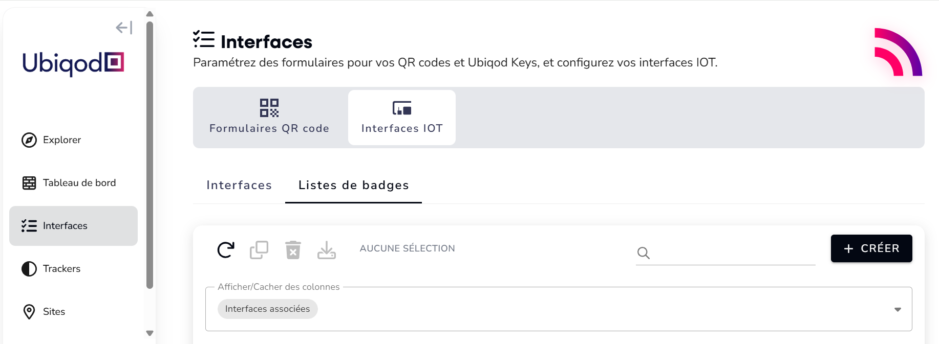 Dans le menu Interfaces, allez dans l'onglet Interfaces IOT, puis Listes de badges :