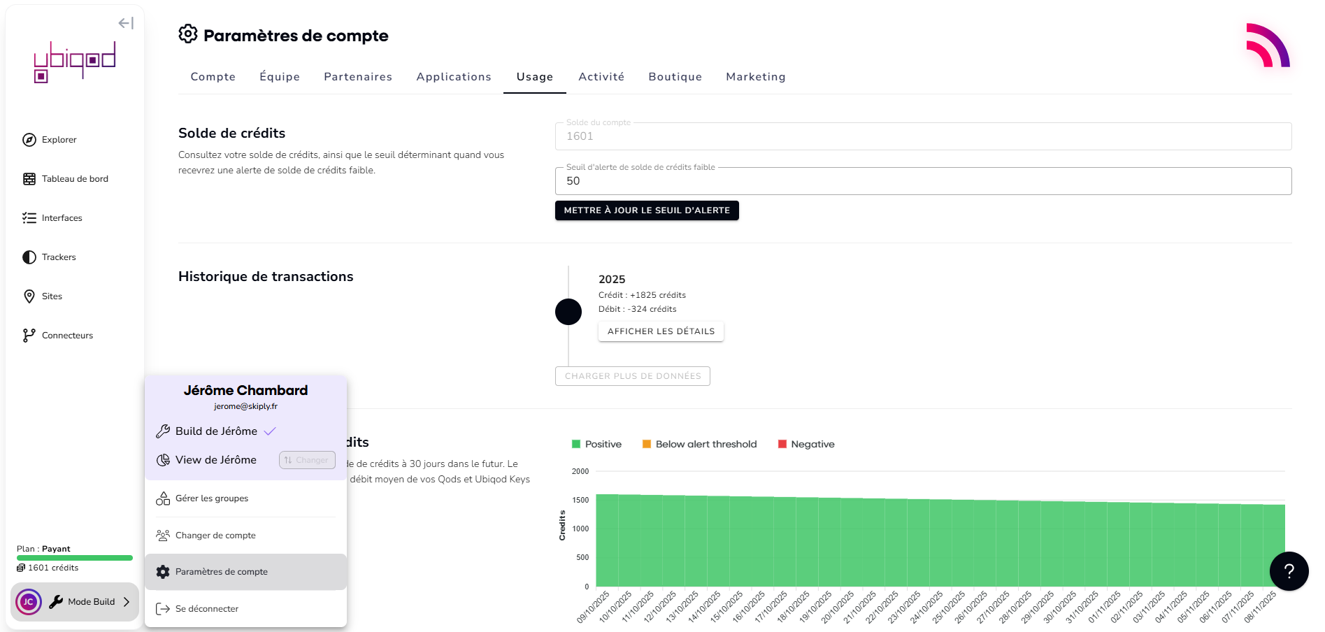 Pour suivre votre consommation de crédit, voir l'historique des transactions et être alerté par email en cas de passage en dessous d'un certain seuil, vous pouvez aller dans les Paramètres du Compte, onglet Usage :