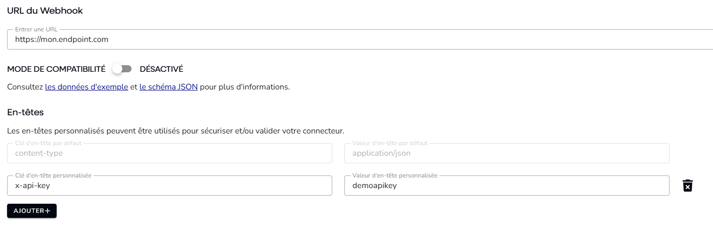 L'URL du webhook définit l'adresse (appelée également parfois endpoint) du système qui recevra les données envoyées par le webhook :