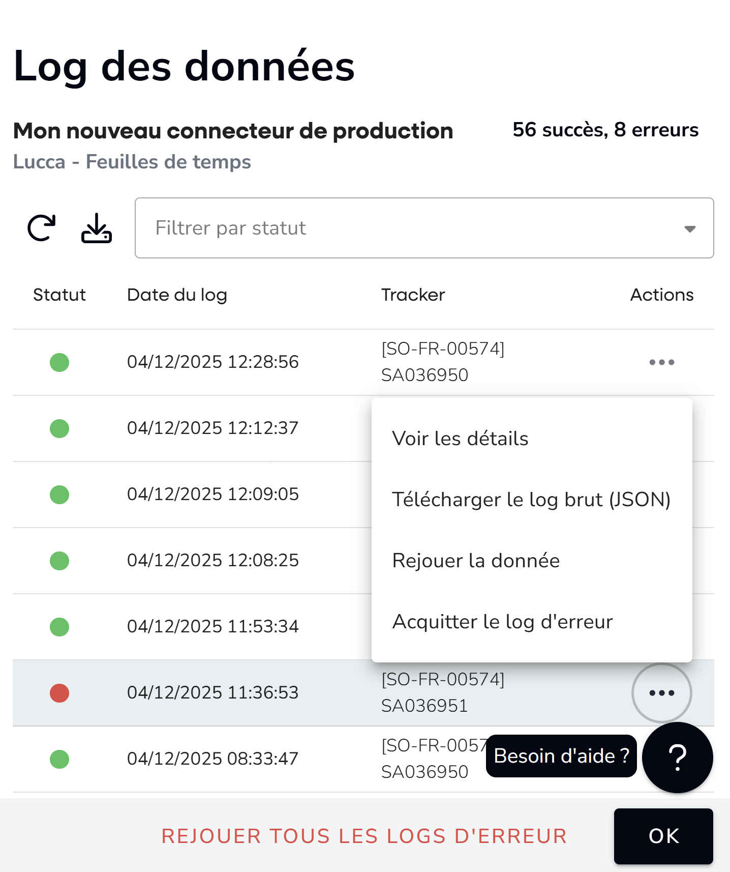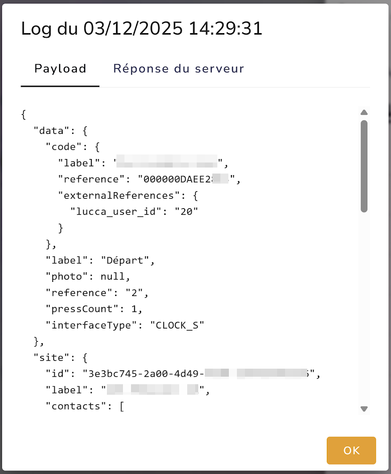La réponse du serveur Lucca est également consultable, et inclus un code d'erreur permettant d'identifier l'origine du problème :
