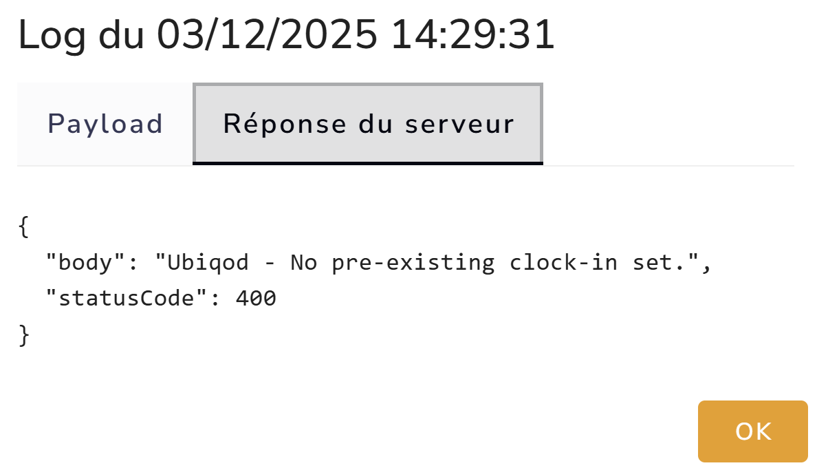 Ubiqod - Invalid Lucca User ID. It should be an integer set in the code's or badge's external references list | Le code PIN ou badge utilisé n'est associé à aucun employé Lucca ou l'ID de l'employé Lucca défini dans le code PIN / badge est invalide. |