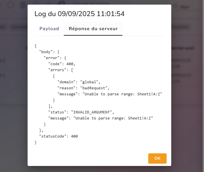 En cas d'erreur (statut rouge), il est possible de consulter la réponse du serveur pour identifier l'origine du problème :