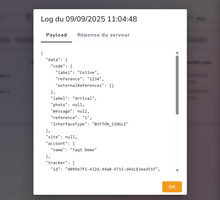 La liste des données reçues depuis un tracker est accessible en cliquant sur le bouton "Voir les logs" dans les actions de la liste des trackers :